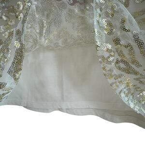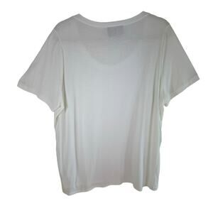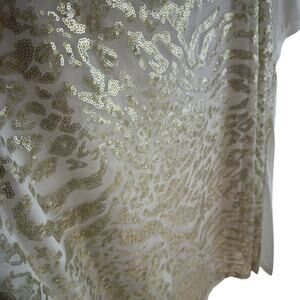 Excellent preowned condition, but has small spot on back of left sleeve. White lightweight scoop neck stretchy top. Gold sequin detail on front. Front panel is polyester, rest of top is cotton/rayon material. Approx. measurements: Shoulder to hem 27", pit to pit 25". Size XL.