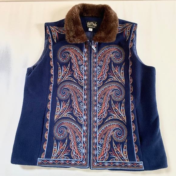 Bob Mackie Women Fleece Vest XL Faux Fur Collar Paisley Boho Western Embroidered