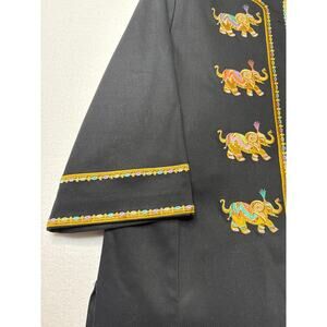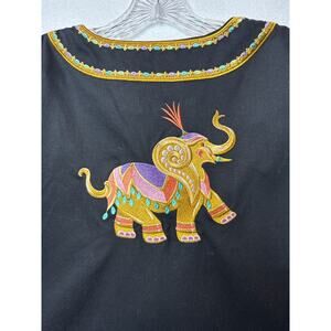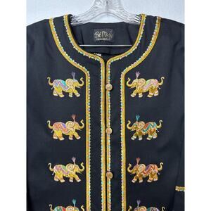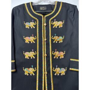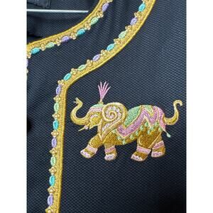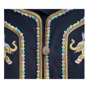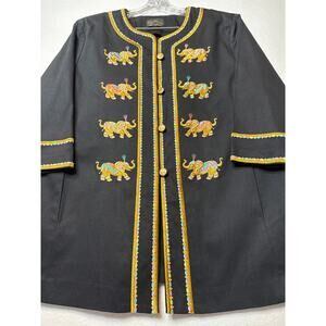 Bob Mackie wearable art black coat embroidered Elephants gold logo buttons large