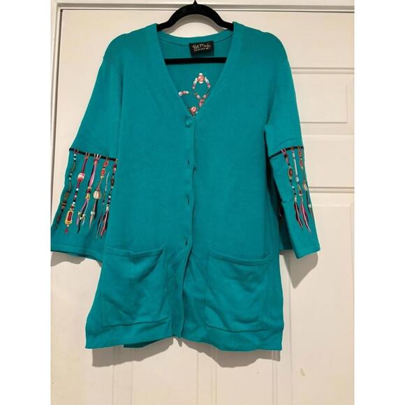 Bob Mackie wearable art native american embroidered sz M cardigan sweater#1399. Gorgeous embroidery of dream catchers. Button down the front. 3/4 sleeves that are bell sleeves. The M size tag is gone, but the pit to pit is 19 inches.