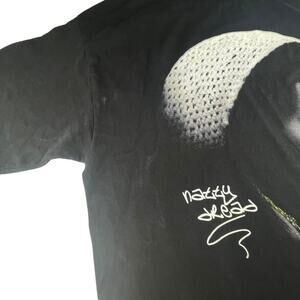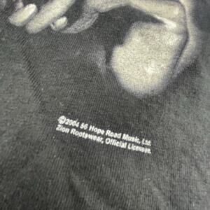 Vintage 2004 Bob Marley T-shirt with “Natty Dread” print. Black and white image of Bob Marley with gold ring detail in color. Zion Rootwear tag, blank back. A must-have for reggae fans.