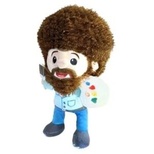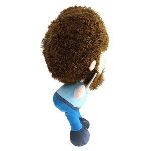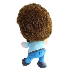 Adorable Bob Ross plush toy holding a paint palette. Features a fluffy brown afro and blue outfit.