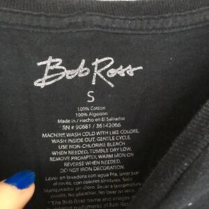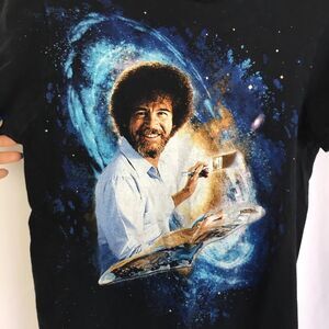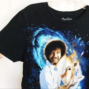 Bob Ross galaxy black graphic cotton t-shirt. Size S. 100% cotton crew neck tee. Large Bob Ross graphic with space galaxy behind him on the front. Graphic shows some sign of wear- some cracking. But colors are still bright. Gives it more of a vintage look. Otherwise in great preowned condition.