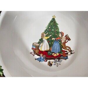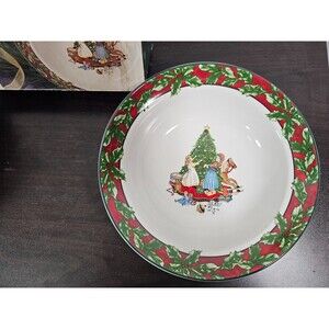 Vintage 1994 Bob Timberlake “Christmas Celebration” 2-piece serving bowl set by International China, Tableworks collection. Each stoneware bowl measures approximately 9½ inches wide and features a nostalgic holiday scene of children decorating a Christmas tree surrounded by toys, bordered with holly leaves and red ribbons. Dishwasher, microwave, and oven safe.