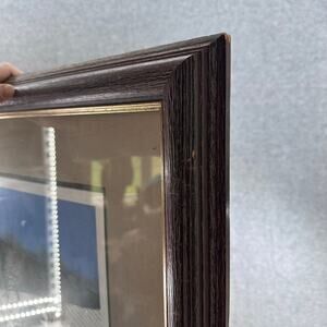 Please see all pictures. There are a few scratches on the wood frame, specifically in the top corners.