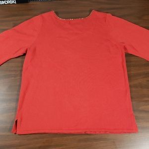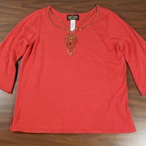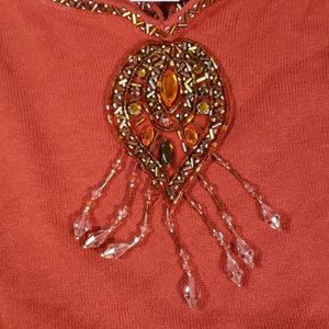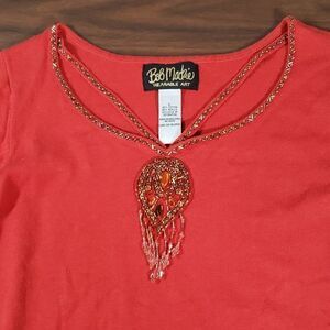 This is a pretty rust colored sweater with a beaded cut-out neckline to resemble a necklace.  The beading goes all the way around the neck, and has 2 additional strips with beafs to look like a becklace. On the body of the sweater is more beading, sort of like a dream catcher.  The sweater has ¾ bell end arms, and 3" slits at each side of the bottom hem.  Size large, measures unstretched