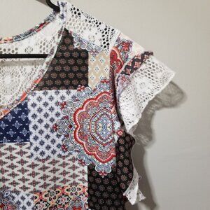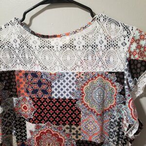 Bobbie Brooks Blouse Women's XL Patchwork Lace V Neck Boho Pheasant