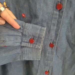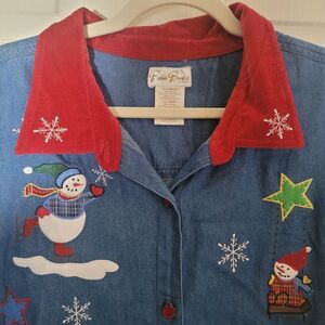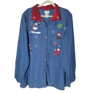Up for sale: Bobbie Brooks Christmas Print Chambray Blouse.