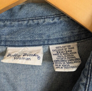 This Bobbie Brooks Holiday Denim Shirt, sized 22/24, is roughly equivalent to a 3X. To ensure the perfect fit, please refer to the measurements provided. It features a charming button-down design with a festive Cardinals in a Holiday winter scene. The shirt measures about 26 inches from armpit to armpit and 31 inches in length. Minor signs of wear on denim in spots.