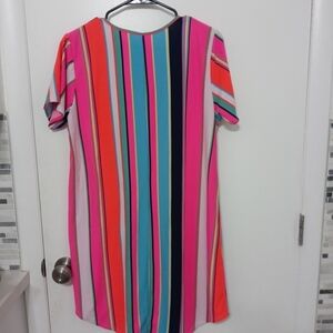 BOBBIE BROOKS SHORT SLEEVE NEON STRIPED STRETCH LOUNGING DRESS/BEACHWEAR KNEE LENGTH COVER UP. HAS 1 TINY INK SPOT ON FRONT PLEASE SEE LAST PICTURE..