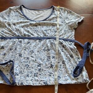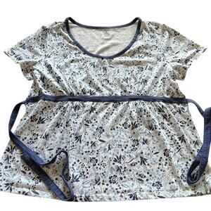 White and blue floral print knit top with empire waist, short sleeves, ties in back