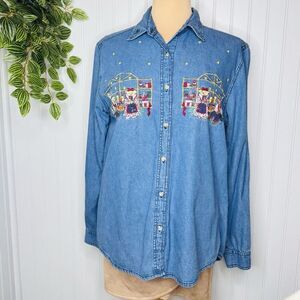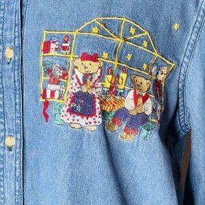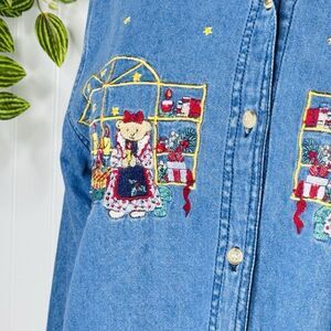 Bobbie Brooks Sz M Denim Christmas Bear Couple Embroidered Button Down Shirt 870