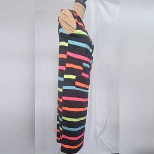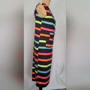 This comfy, casual tee-style midi dress features a hood and bold black, blue, pink, and orange stripes—perfect for throwing on at the beach or styling up for a laid-back day out.