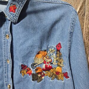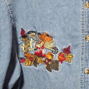 Bobbie Brooks Vintage 90s Denim Teddy Bear Fall Scene Embroidered Button Down Sh