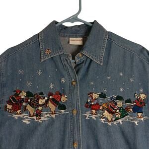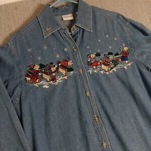 Bobbie Brooks Vintage Denim Shirt Womens Size M Blue X-Mas Bears Embroidered