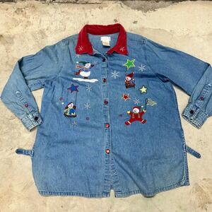 Bobbie Brooks Woman Denim Christmas Embroidered Shirt Size 14W Holiday