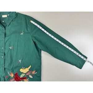 Add a touch of nature-inspired charm to your wardrobe with this Bobbie Brooks Woman embroidered button-up shirt. Featuring beautifully detailed red and yellow cardinals with leaves and berries on a rich green cotton fabric, this blouse is both unique and comfortable.