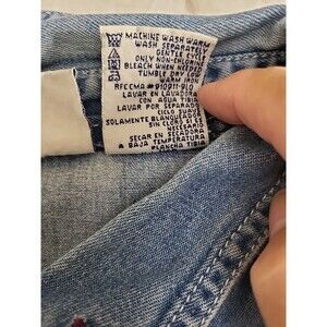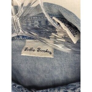 Up for sale is a Bobbie Brooks women's button-up top in size Large, perfect for a casual occasion. This blue denim top features embroidered accents, a collared neckline, and long casual sleeves with a solid pattern. The top is made of 100% cotton and is machine washable for easy care.