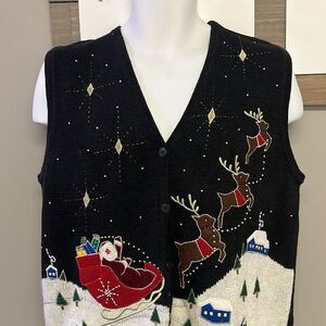 Bobbie Brooks Women’s V-Neck Ramie Blend Santa Reindeer Christmas Eve Beading Embroidery Sleeveless Vest-L