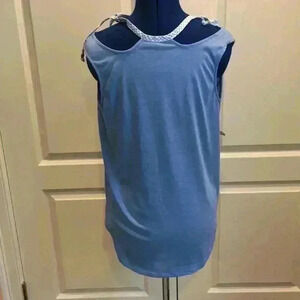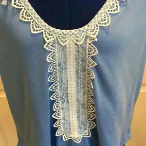 Bobbie Brooks tank. Light blue w/lace and gingham ties. 200% polyester. Size L. Bust 29.5”. Shoulder to hem 23”. Curved hem which is slightly longer in back. All measurements are approximate. Thank you for coming by our closet. We are a fast shipper! F396 B6
