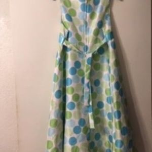 Great Spring and Summer Dress for any dress up occasion. Back zipper with back tie. L Mid length polyester and nylon with a pretty sheen to it. Beautiful in person.