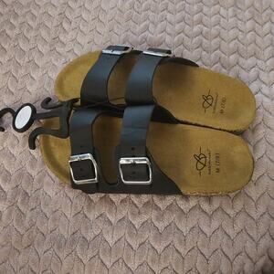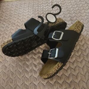 NEW Bobbiebrooks Black Leather Double Strap Cork Sandals Slides Women’s Size 7/8