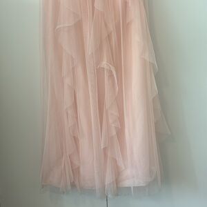 Soft, sweeping ruffled flanges cascade down the skirt of this illusion one-shoulder bridesmaid dress. A smooth, shimmering sash at the waist completes the look.