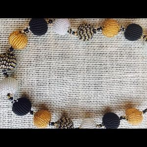 Beautiful hand made necklace from South Africa. Intricate details with black, metallic gold and metallic white.