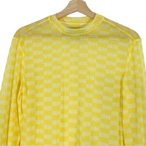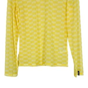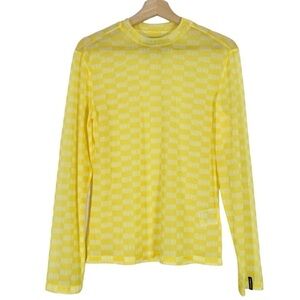 features: This top is a classic iconic y2k rave style fit. Perfect with you favorite wide leg jeans. Nylon blend mesh fabric in acid yellow. Crew neckline. Long sleeves. Pull over.
