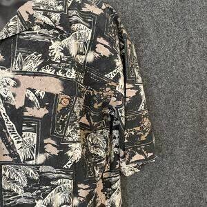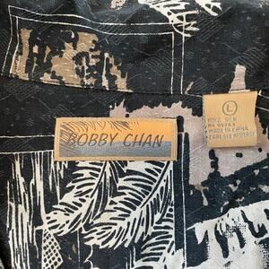 Bobby Chan men’s short sleeve Hawaiian shirt, size large. 100% silk fabric in black and tan with tropical palm tree and island print. Button front with coconut-style buttons, camp collar.