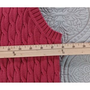 The Bobby Jones Collection Red Golf Cable Knit Sweater is a classic and preppy men's vest perfect for casual or business occasions. Made in Hong Kong with a medium size fit, this sleeveless sweater features a V-neckline and a solid red color. The cable-knit fabric provides a breathable and stretchy feel, making it ideal for winter and fall seasons. With its collarless design and regular fit, this sweater is not only stylish but also functional, suitable for activities like walking and golf.
