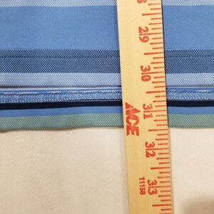 This is a Bobby Jones Performance Polo Shirt for men in size Large with a blue striped pattern. It features a collared neckline, spread collar style, button closure, and short sleeves. The shirt is made of a breathable blended fabric (polyester, spandex, polyester blend), suitable for all seasons. It is designed with accents like buttons, embroidery, and a logo, ideal for outdoor activities and sports such as golf.