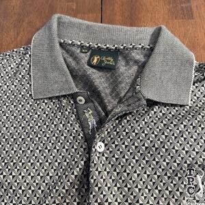 The Bobby Jones TPC Sawgrass Golf Polo in men's size XL is a stylish and comfortable piece made from 100% cotton. This polo features a geometric pattern in gray, short sleeves, a collared neckline with a button closure, and a spread collar style. Perfect for casual occasions or a day of golfing, this polo is machine washable for easy care. With the Bobby Jones brand logo accent, this polo offers a regular fit and is ideal for the summer and spring seasons.