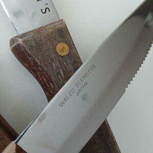 Set of four jumbo 5” Rustic stainless steel Walco- made in Japan blades with wood handles fastened with brass fittings, marked Bobby Van’s Steakhouse (established 1969), purchased at the iconic NYC steakhouse. preowned