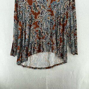 Bobeau Blouse Women's Sz M Brown Blue Paisley V-Neck High-Low Hem Tunic Pullover
