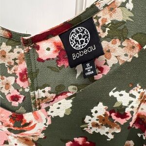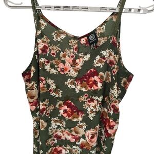 Chic camisole top with floral design. Features green base with red and white flowers.