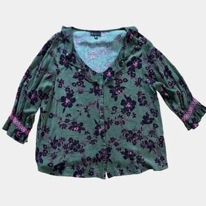 Bobeau Floral Ruffle Button Up Blouse Size 2X Olive Fuchsia 3/4 Sleeve Smocked