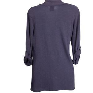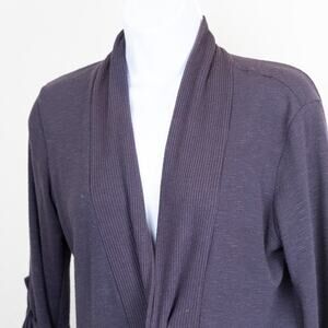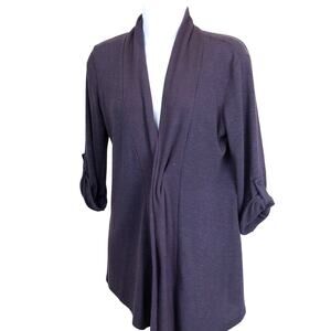Bobeau Gray Knit Open Front Cardigan, Size Medium. Roll tab sleeves. Lightweight, fine guage knit. Summer weight. Has a brownish tinge, depending on the light. But definitely dark gray. Polyester, Rayon, Spandex blend. Good used condition with some signs of wear, but no snags or rips. Has lots of life left.