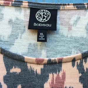 This Bobeau top feature a multicolor animal print, 3/4 sleeves, a round neck, and a peplum top.
