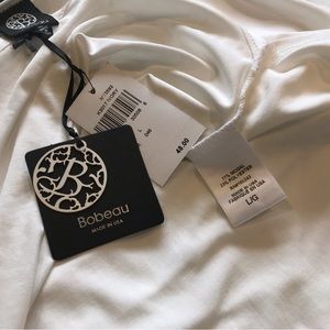 NWT. Cream color Bobeau tunic with a shirttail hem and raw edge at the neck. It is oversized. Measurements lying flat: Shoulr 27”, sleeve 25”, front length 23” and back is 25”.