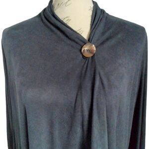 This chic and dramatic wrap style cardigan is cut with an asymmetrical hem and secured with a one button closure at the neck.