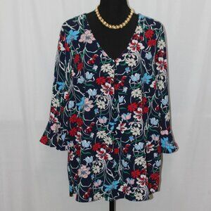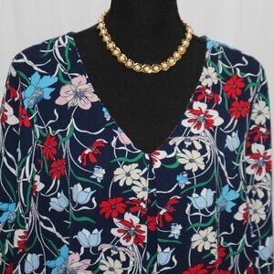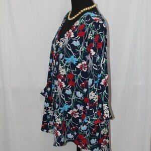 Bobeau Navy Floral Long Sleeve and V-neck Top