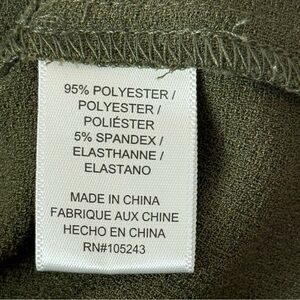 Comfy and flattering Bobeau tunic-style blouse in a versatile olive green shade. Features a notch V-neckline with front pleats for a relaxed drape, short sleeves, and a stretch fabric that offers ease of movement. Great for work, casual wear, or layering.