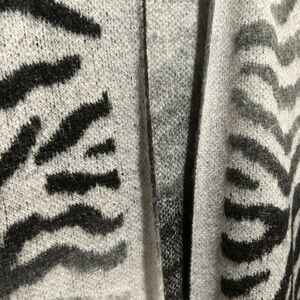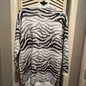 This is a beautiful soft open cardigan with a long silhouette in a fun sexy zebra animal print with double front pockets for a trendy style.