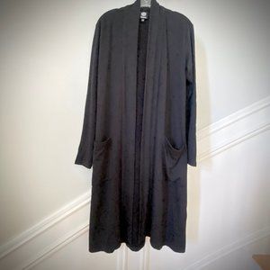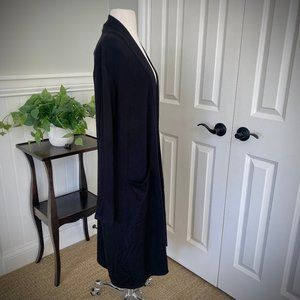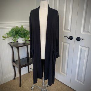 Like new, this knit cardigan features two front patch pockets and an open front. The inside is lined in super soft fleece. Rayon/Spandex. Hand wash cold. Excellent condition - no holes, stains, or fading. Flat measurements: Bust = 20" (pit to pit, measured across back), Length from back of neck = 44". Fits TTS.