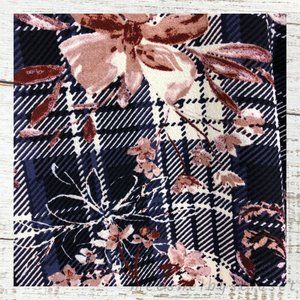 Beautiful purple-ish blue / black / ivory / pink blouse with plaid print background and large floral print on top. 3/4 flutter sleeves. Round / scoop neck. Plus size. This brand is sold at Nordstrom Rack.