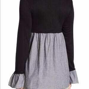 Features- long sleeve, V neck, stripped poplin trim on sleeve and back, jersey knit front, hi /lo hem