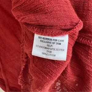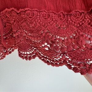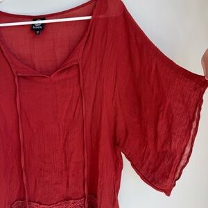 Chic red blouse by Bobeau. Features a relaxed fit and lace hem and has a lightweight feel with flowy sleeves