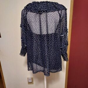 this has a dark blue inner blouse with adjustable straps pit to pit 16 inches but it stretches out blouse blue with polka dots has ruffles on sleeves and bottom of sleeve has elastic top bodice has 4 small buttons and stretches 100 % polyester Top blouse is see through but it has the under shell