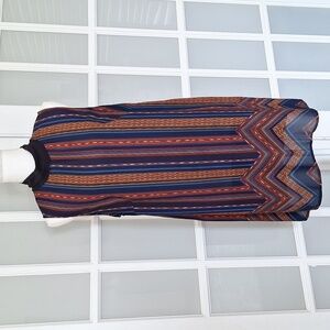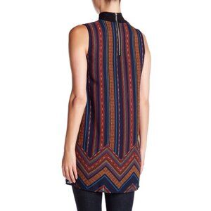 Embrace the bohemian spirit and let your style shine with this effortlessly chic and free-spirited top. Featuring a stylish combination of stripe and chevron patterns. The thoughtful design includes slits on both sides, mock neck and back zipper.